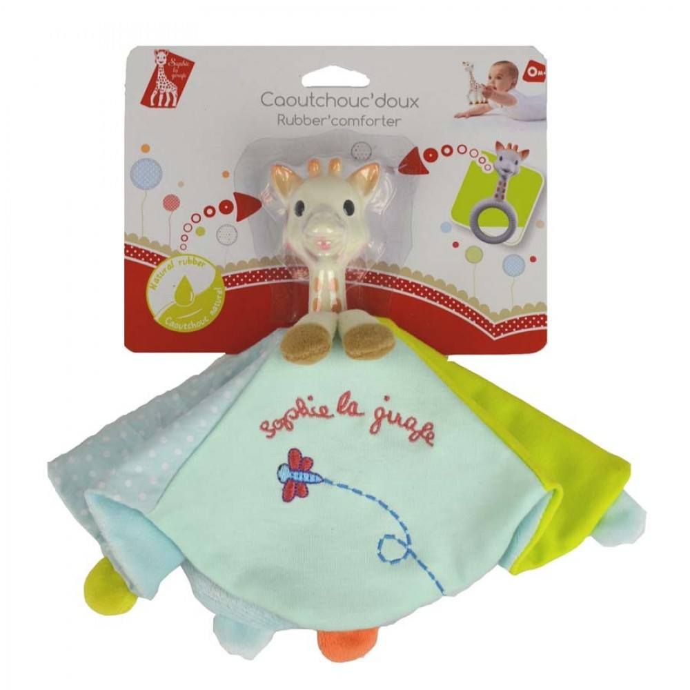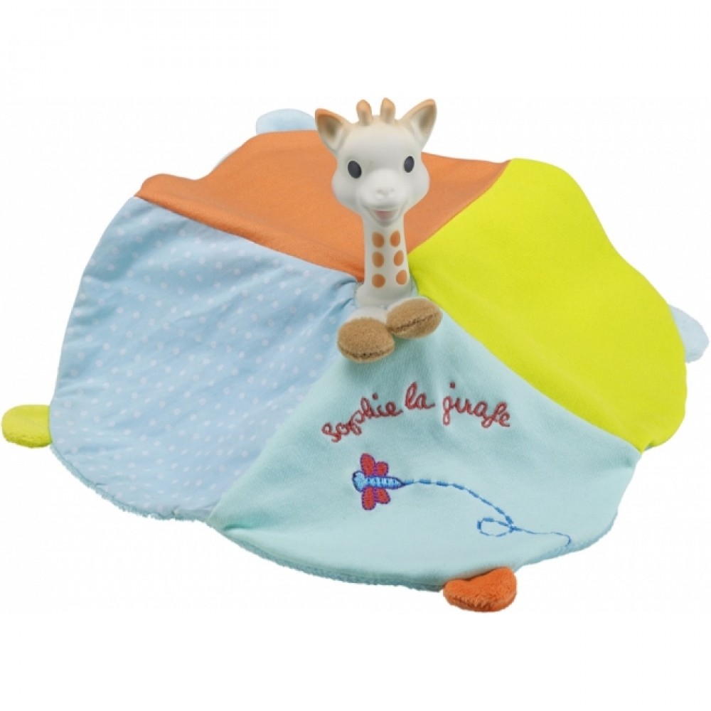 2- Πανάκι αγκαλιάς για να αισθάνεται πάντα την παρέα της Σόφι! Εϊναι φτιαγμένο από διάφορα υλικά για να ανακαλύψει και να του παρέχει ποικιλία στην αίσθηση της αφής. Εϊναι ελαφρύ και εύκολα μπορεί να το πιάσουν τα μικρά του δαχτυλάκια.
